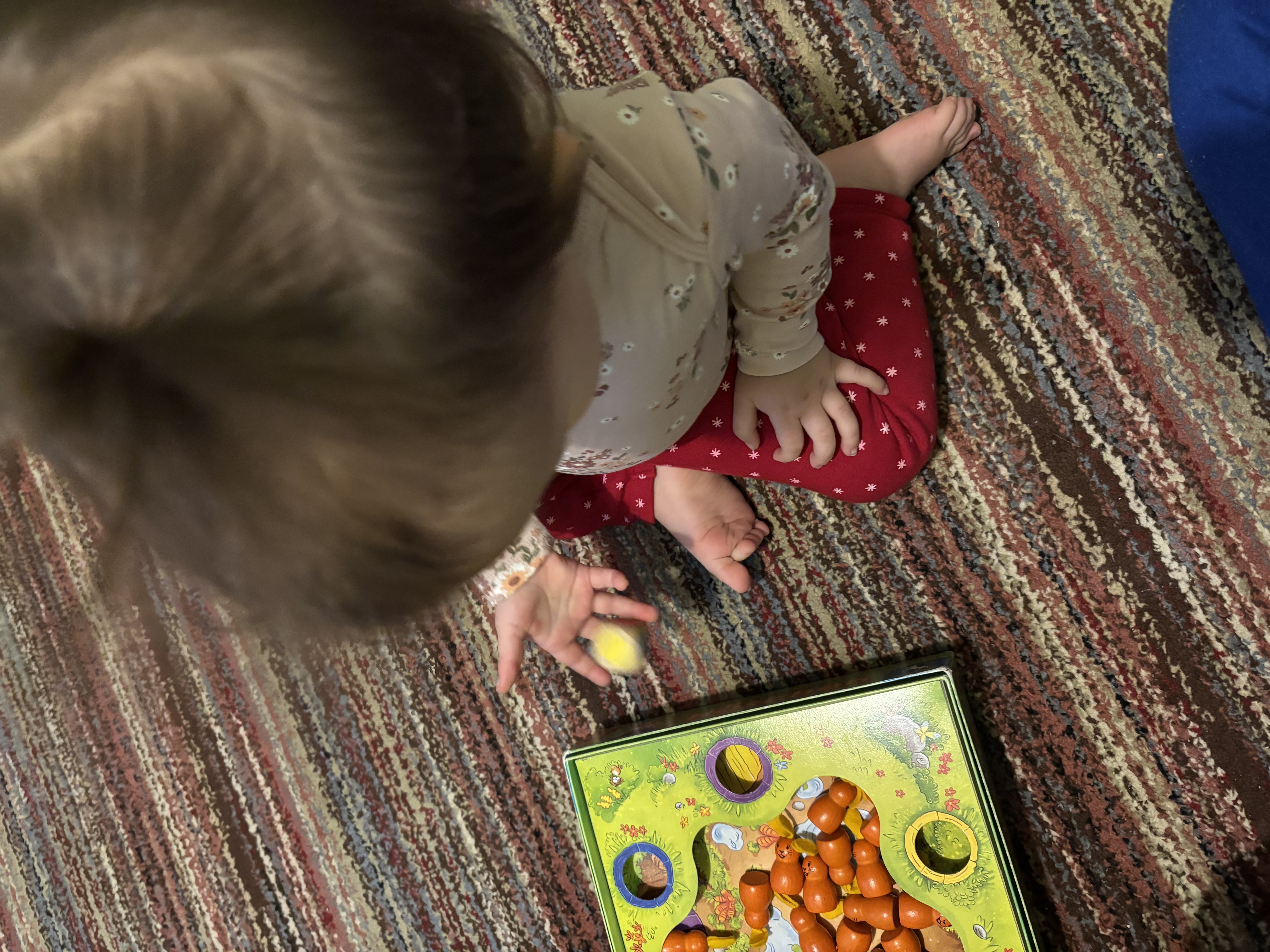 So my younger daughter just turned one and a half, and I remembered that her older sister was already playing Hopp Hopp Haschen at that age, so I took the game off the shelf. For now, like a proper toddler, all she really does is take games down from the shelves and pull them apart. I figured we might as well see how far we still are from actually playing board games together.